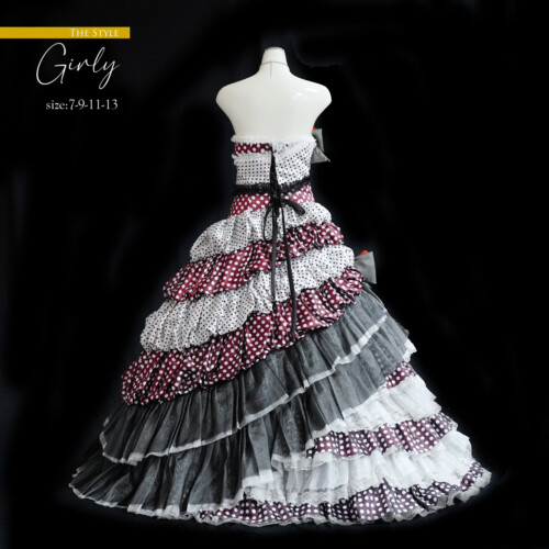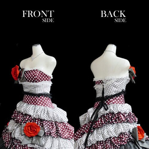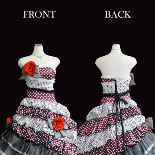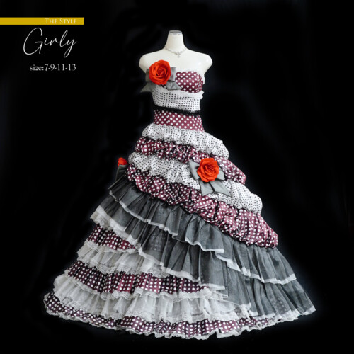 ドット柄のサテン生地にレース、チュール素材を交互に重なり合わせアシメトリーに仕上げたドレス。ふんわりと膨らませたバルーンスカートがスイートなイメージが魅力的たっぷり。インパクトを感じさせる大きな赤い薔薇のコサージュが目を引きます。