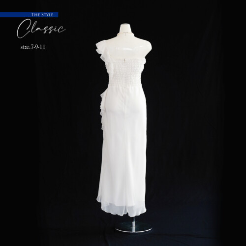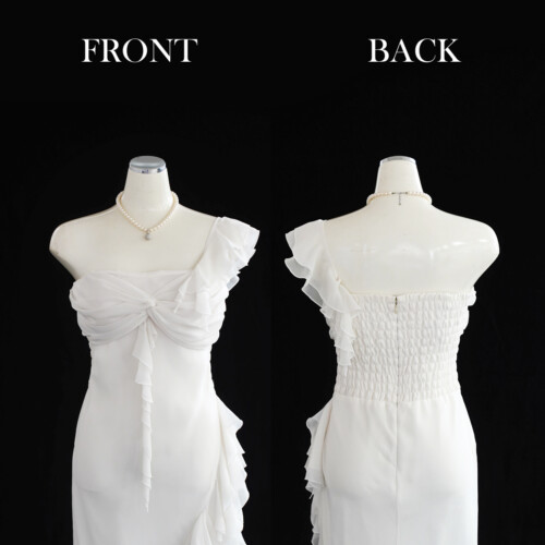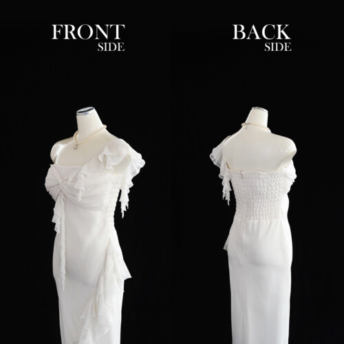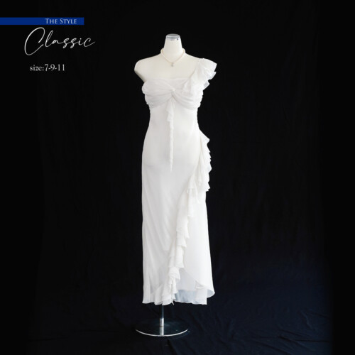 シフォン素材を生かしたカールフリルを肩から胸元には包み込むように、ウエストから裾に流れるように使用し、やわらかみのあるふんわりしたシルエットがポイント。ミモレ丈のスカートドレスが足元を綺麗に見せ足長効果も◎