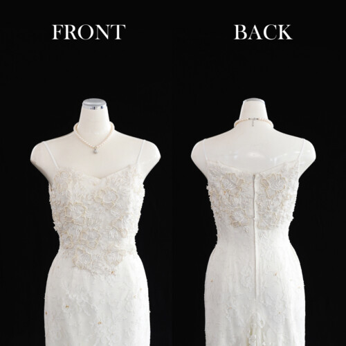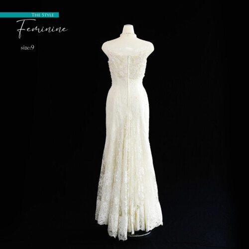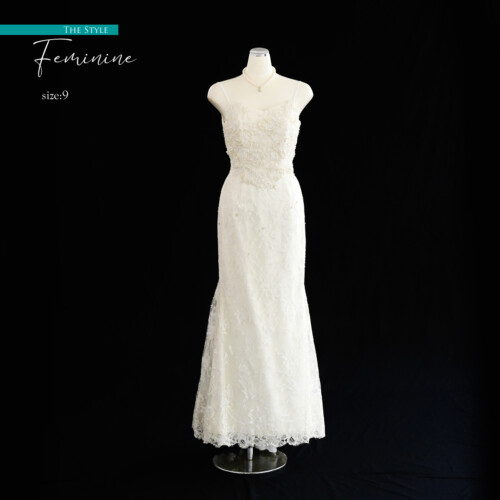 柔らかなレース素材のマーメイドドレス。衿元を大胆に見せエレガントで大人っぽさ感じさせるデザイン。スカートフリルに立体の花が全体的にやわらかな印象となり美しくかつかわいらしさの残るドレスです。