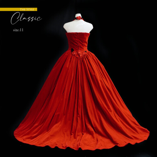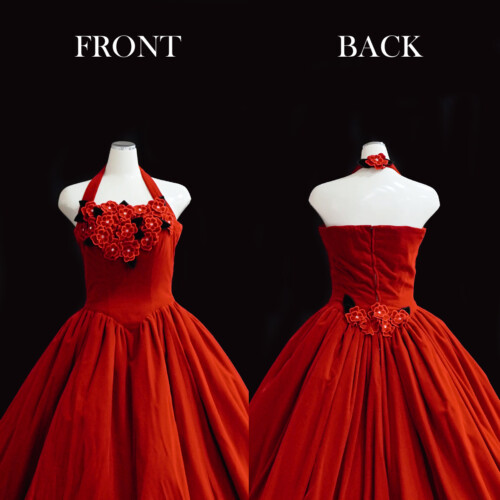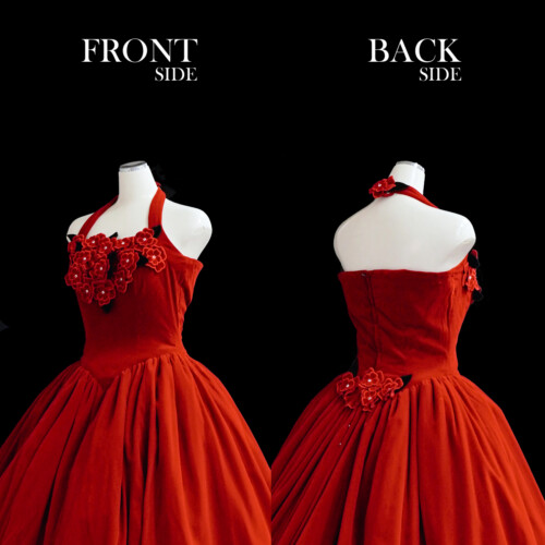 毛足の短いベルベット素材を使用し深みのある赤色が映え上品さを感じます。ホルダーネックデザインがデコルテラインを甘すぎない雰囲気を与えます。