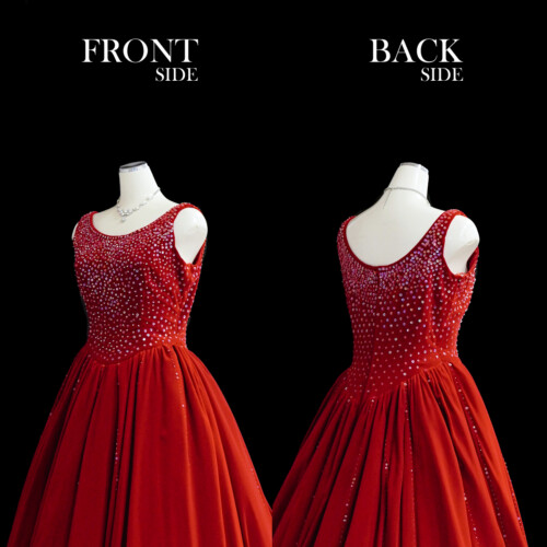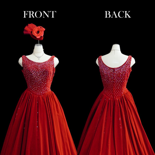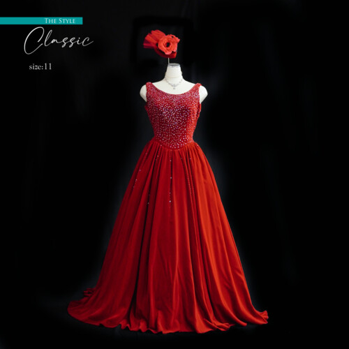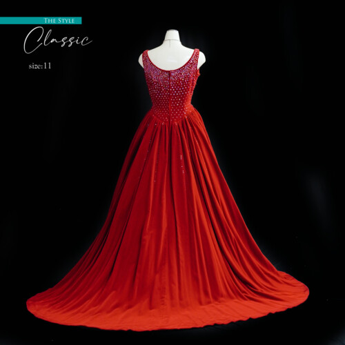 上質なベルベット素材がシンプルなデザインを生かした高級感を漂うカラードレス。胸元には、びっしりと敷き詰めたスパンコールがキラリ輝きを放って華やか。ヘッドドレス、アクセサリーでアレンジすることで、印象の変化が楽しめます。