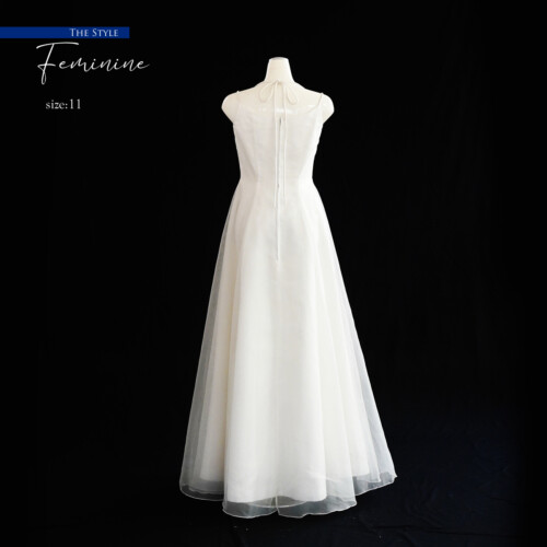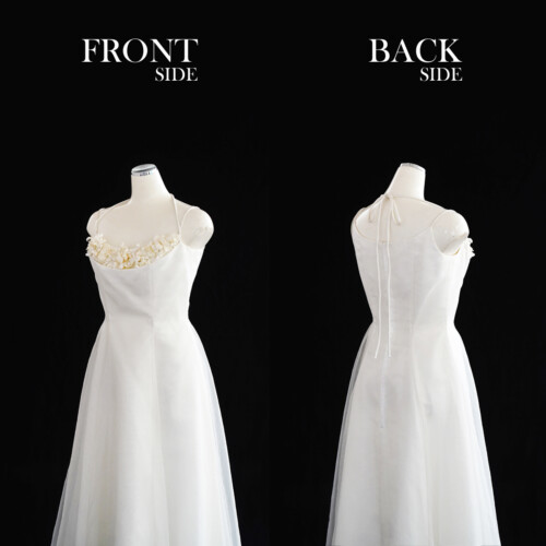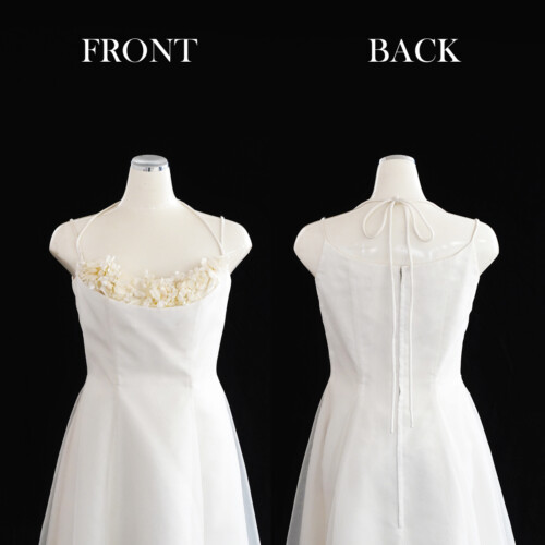 定番チュールのAライン。胸元にある白い小花のモチーフが少し見えかくれしたデザイン。小花部分は取りはずしが可能なのでちょっと雰囲気を変えたい場面や撮影シーンなどで変えてみるとシンプルで清純な印象となります。