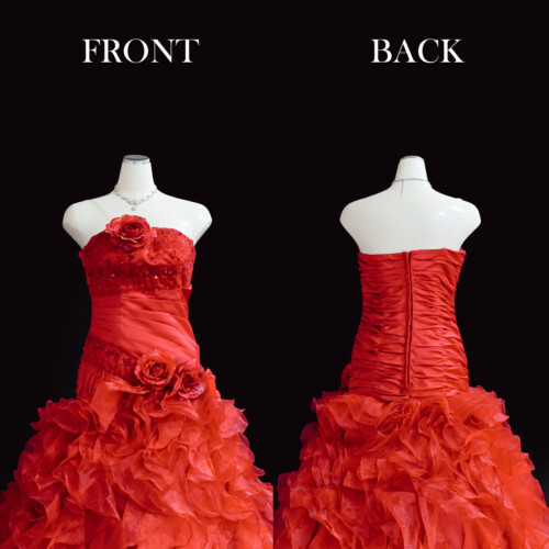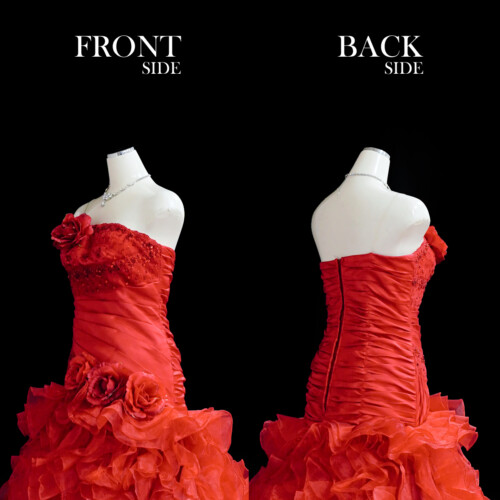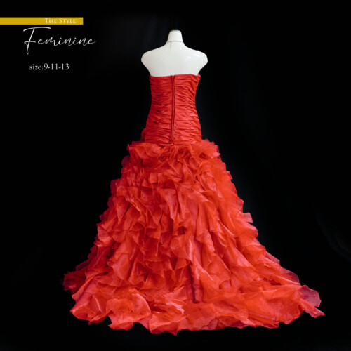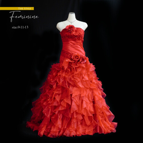 流れるようなギャザーラインにスパンコールとビーズ加工を施し着痩せ効果を感じさせます。大きな薔薇のコサジュがひときわ存在感をあり、何枚か重なり合ったフリルが歩くたびにフワリと揺れます。ヒップラインを優しくカバーしたマーメード風のアシメトリードレス。