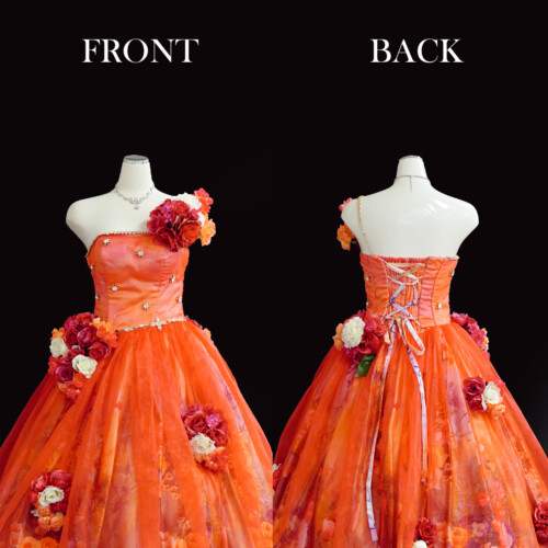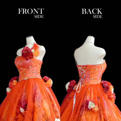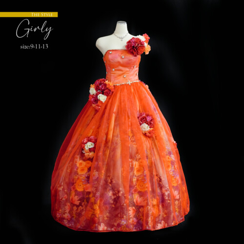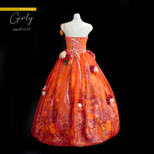 水彩画のような花の絵柄をプリントされた生地の上に色鮮やかなシフォンチュールを優しく重ねあわせたドレス。フェミニンさを感じさる花柄ドレスは花嫁さんの心を奪われます。立体的な花のコサージュを各箇所に付けられています。取り外し可能なので、お好きな箇所に付け替えが出来ます。