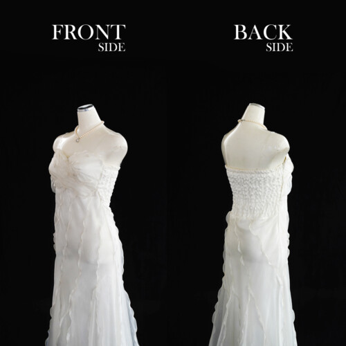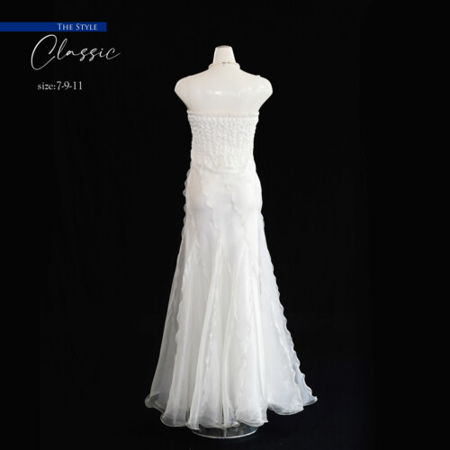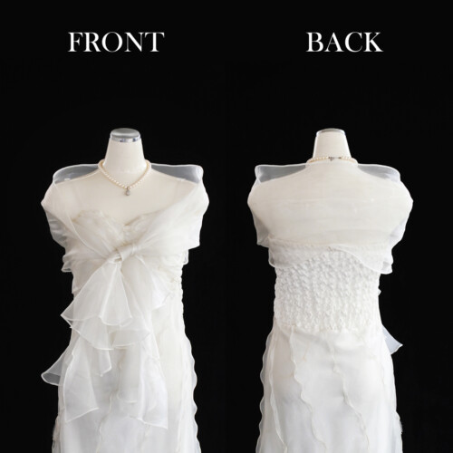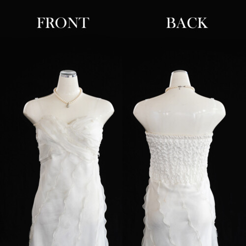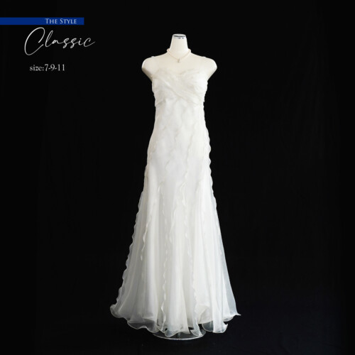 オーガンジー素材を何層か重ねたやわらかみのあるビスチェドレス。胸下から足元まで斜めに流れるような縦フリルが足長効果アップ。背中のシャーリングにより着心地が良くフィットするデザインです。