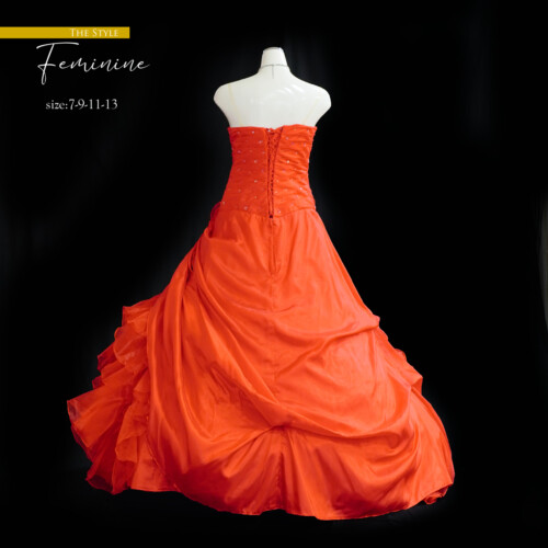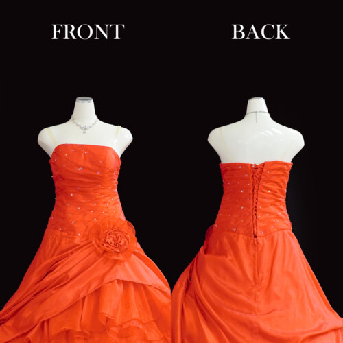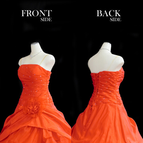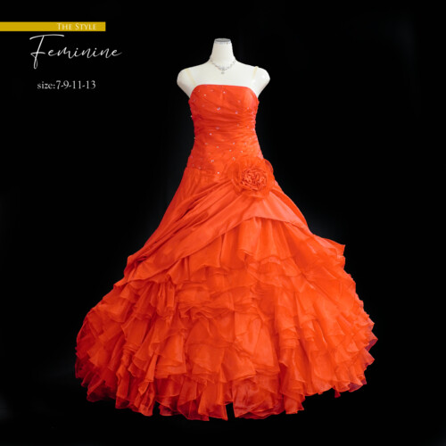情熱的な赤色のカラードレスは、上品でエレガントな印象を与えます。フワフワのフリルに包まれてボリューム感もたっぷり。背中で編み上げスタイルでサイズ調整ができます。