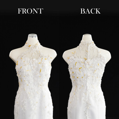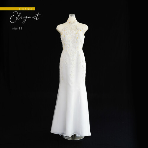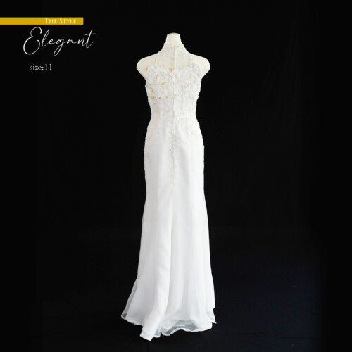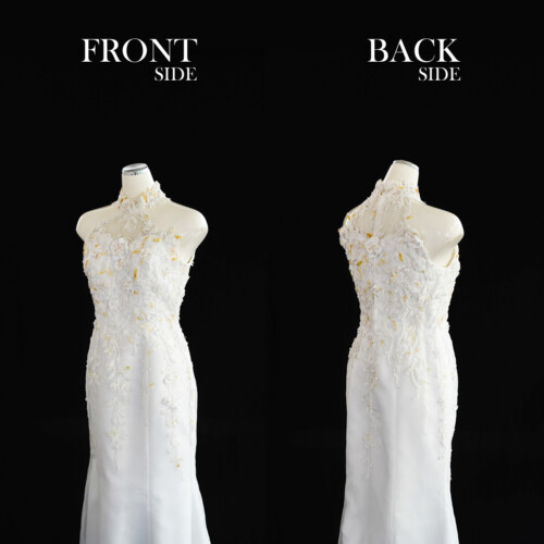 ボディーラインを美しく見せるマーメードドレス。ジョーゼットのフラワーモチーフを重ね合わせ気品を感じさせるドレス。ホルダーネックデザインがより一層、上品さと華やかな印象をあたえます。