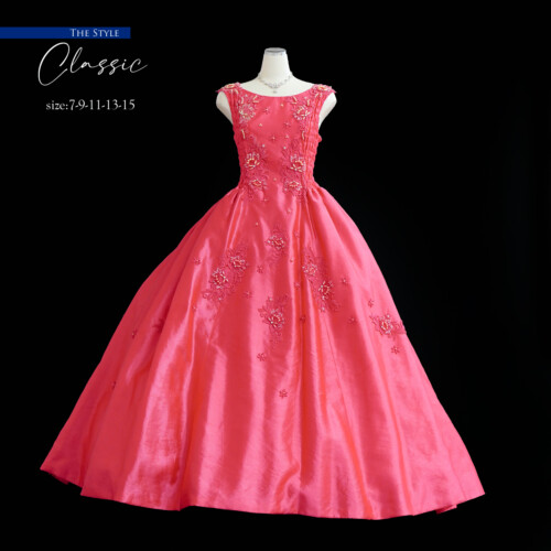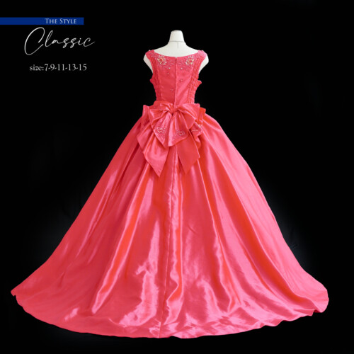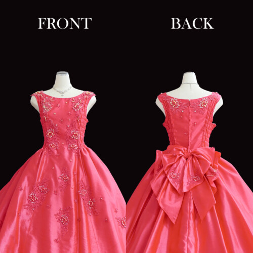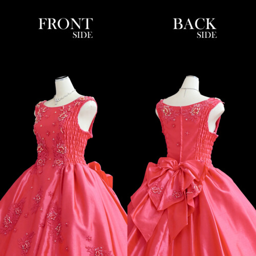 ぱっと目を引く、色鮮やかなカーマインレッドのドレス。胸元には光り輝くピンクパールがびっしりと引き詰められております。袖下のシャーリング加工で補正無しでサイズ展開できます。