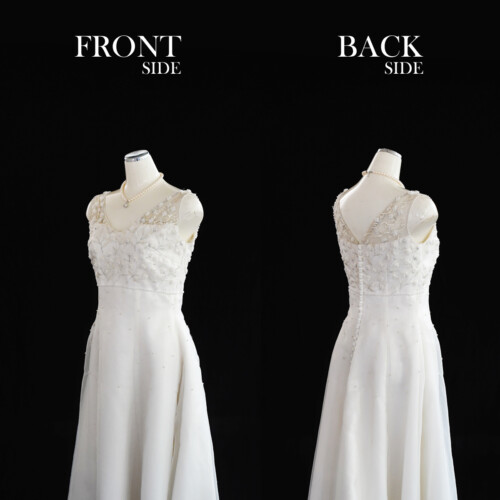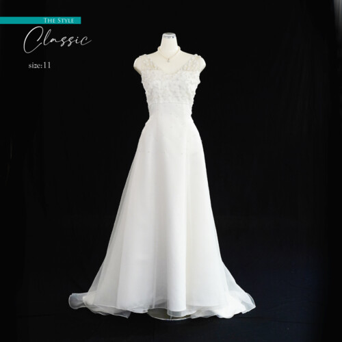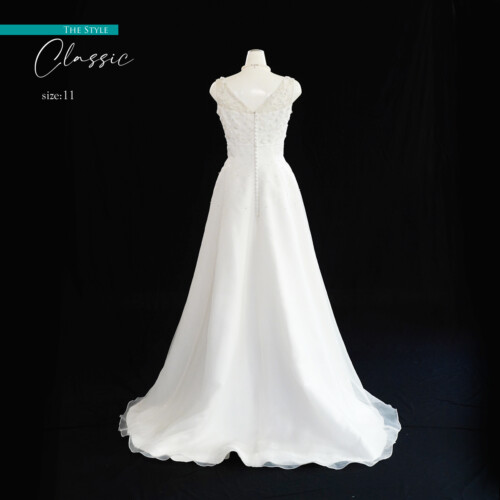 デコルテ部分にオーガンジー素材の透け感が清純で無垢な女性らしい美しさが感じられるデザインで背中から腰のラインまであるドットボタンがとってもキュートな一着。