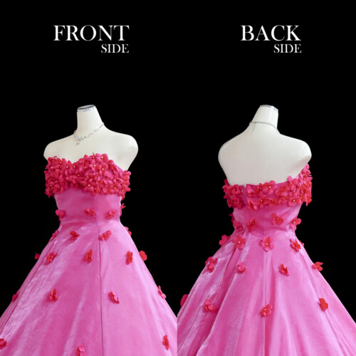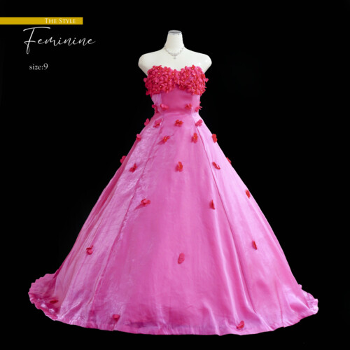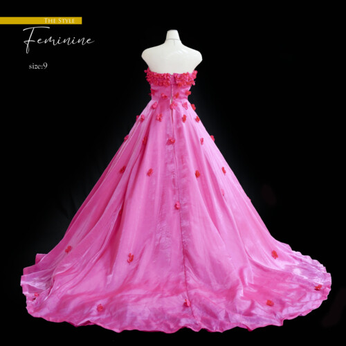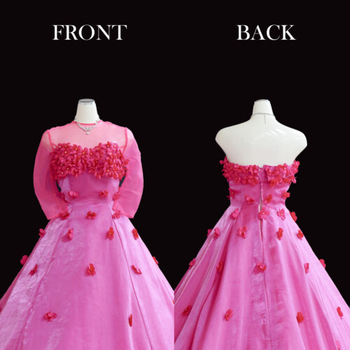 シンプルなビスチェタイプのAラインなのに華やかさを感じます。光が当たる箇所によって発色の変化を感じます。見頃に散りばめられた小花のアップリケが、フェミニンなイメージを与えます。