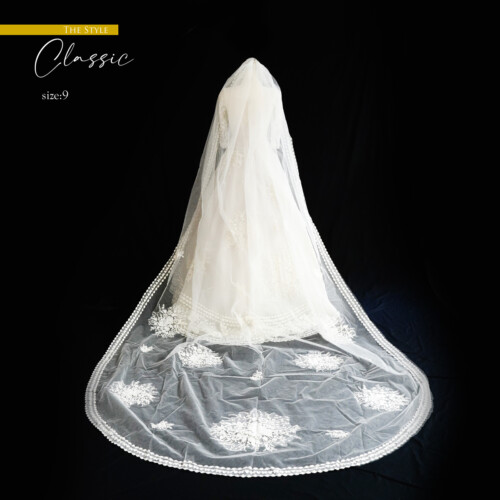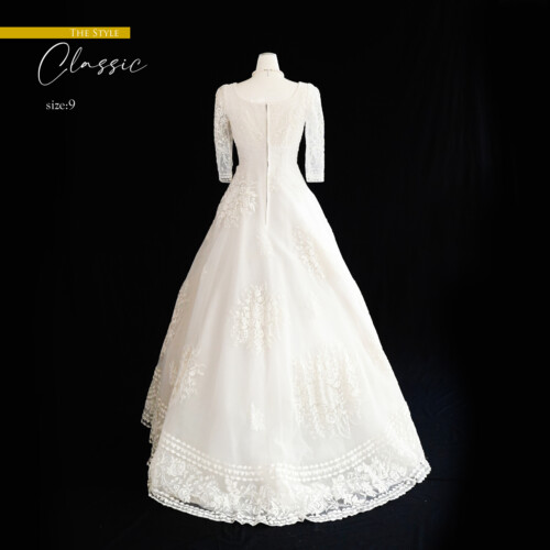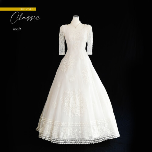 オーガンジーの柔らかなスカートと品の良さが際立つクラシックな七分袖のオフショルダーレースはまさに王道エレガントスタイル。
