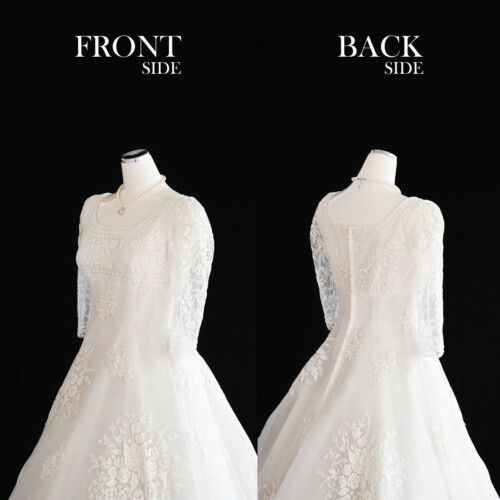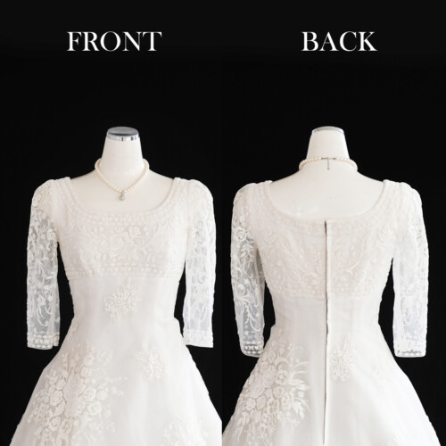 表地のレース全体に花束をモチーフにしたデザインで生地にフロッキー加工を施した珍しいドレスです。