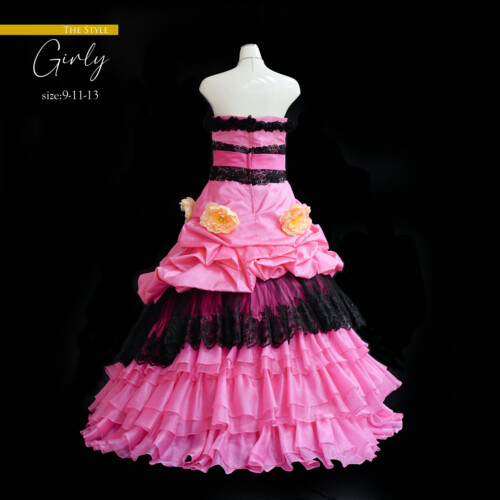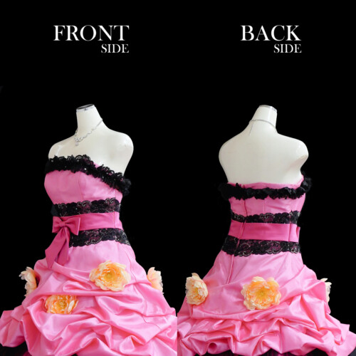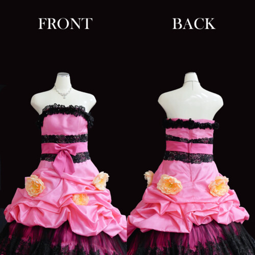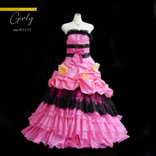 艶やかなローズピンクに幅広の黒レースをフリルがアクセントなって女性のエレガントさを引き立ててくれます。バルーン風のスカートラインの膨らみが甘さをプラスしています。大きめの花のコサージュが華やかに映えます。