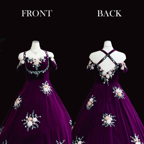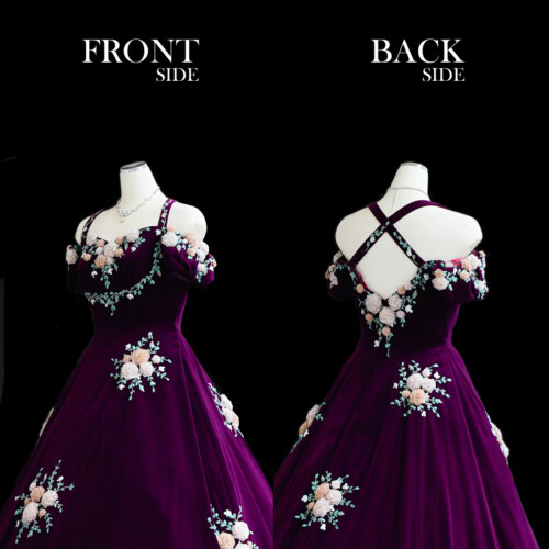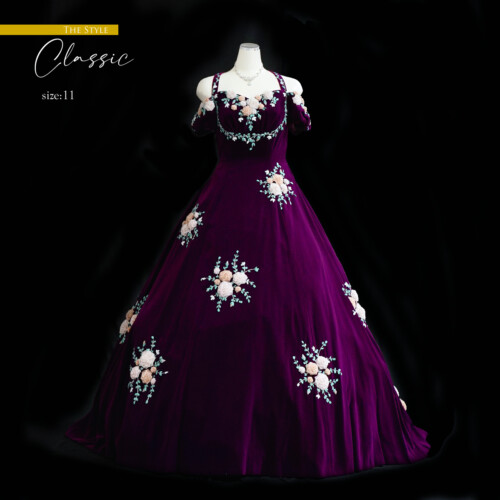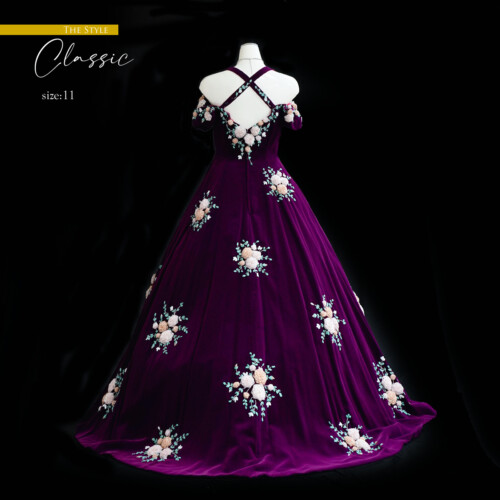 大人っぽさを感じるラズベリーパープル、上質のベルベット素材で深みある華やかさを演出。手作業で施されてたリボン刺繍の花が彩りを添えて上品さを感じます。ウエスト切り替えもな流れるようなハイウエストライン、胸元から肩までを広く見せるラインとで精密に計算されたデザインが融合した一着。