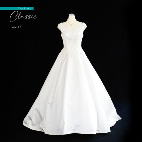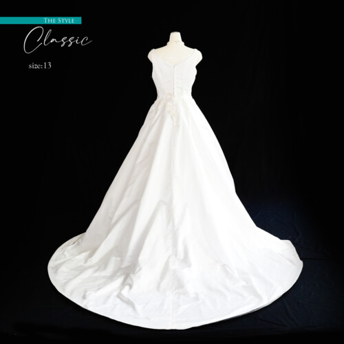 ショルダーラインが綺麗なノースリーブのAラインドレス。上見頃にカットレースを施してスカートはシルクをたっぷりと使用して作られたタフタという素材で施されています。シルクタフタ生地は少し硬くハリがあり、光沢感、艶感があり、自然光やライトが当たる度にキラキラと輝きます。