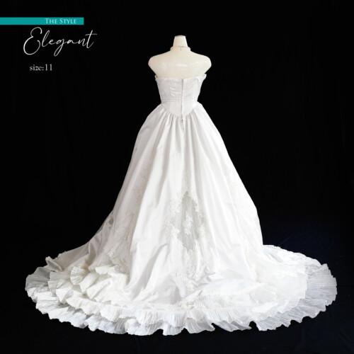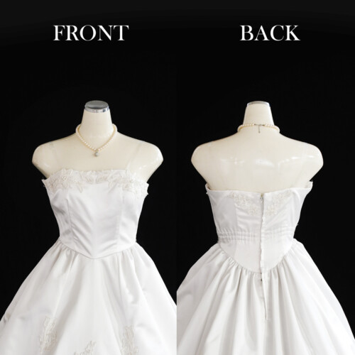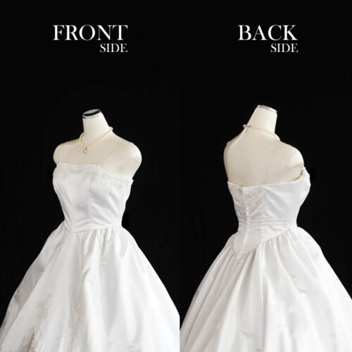 光沢のあるシルクサテン素材を使用したAラインドレス。エンブレム刺繡がとてもエレガントな雰囲気◎