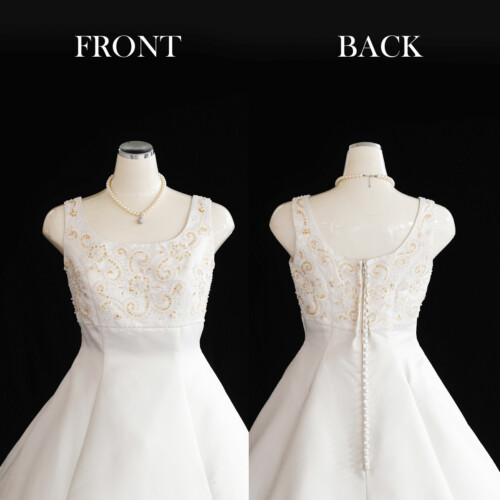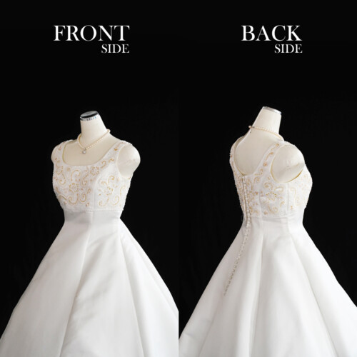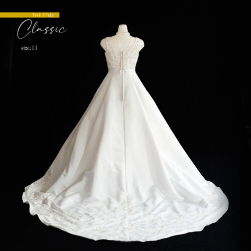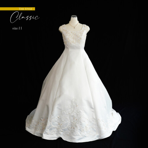 ドレスの素材を生かしたシルクタフタのシンプルなAラインドレス。アラベスク模様の細やかな刺繍を胸元とスカート裾に施されよりエレガントさを引き立てています。