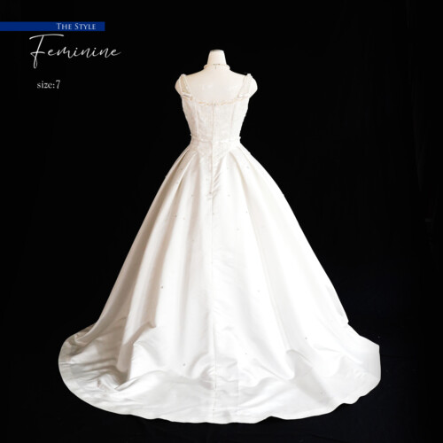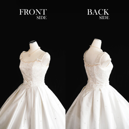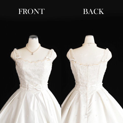 オフホワイトカラーのサテンシルクを使用した王道Aラインドレス。上見頃のオーバーレースが柔らかな風合いを感じさせます。腰の切り替え部分に小さなリボンとってもキュートで女の子らしい印象です。