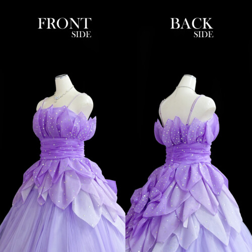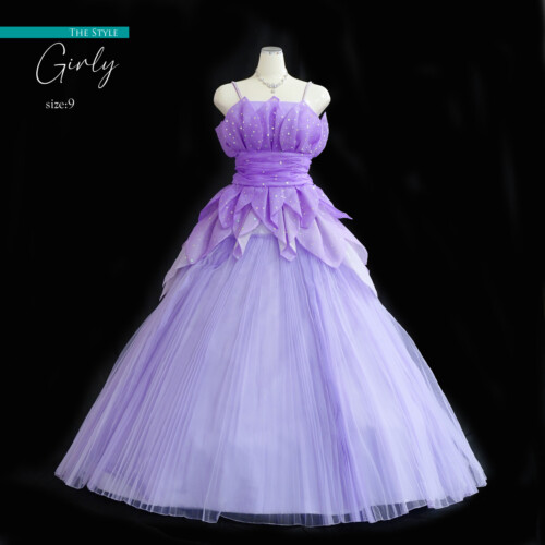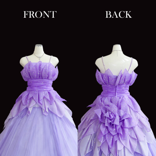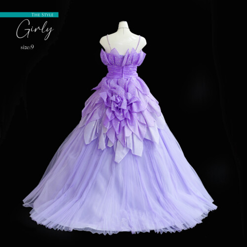 ドレスそのものを花に見立てて花びらに模ったパーツを一枚一枚と重なり合わせて仕上げたフェミニンなドレス。見頃からスカートにかけてグラデーションがおしゃれ感をアップ。バッスルに大輪の花のようにみせたデザインは後ろ姿を華麗に演出。