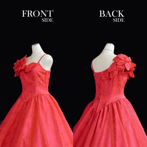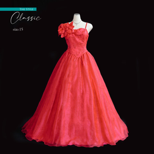 ワンショルダーに大きな花のコサージュ、お顔の周りを華やかに魅せてくれます。アシメトリーとウエストのV字切り替えが錯視効果によって、すっきりとしたイメージします。ボリューミースカートには同色のグリッターが散りばめられておりを動くたびにキラキラと光を放ちます。