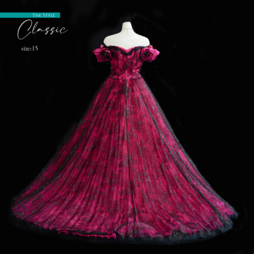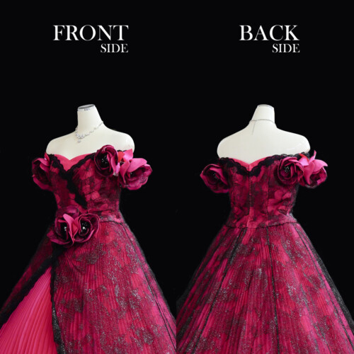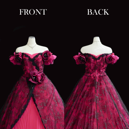デコルテを美しく見せるオフショルダー、細かいアコーディオンプリーツがラインをスッキリと見せてくれます。ローズ色に光沢な黒レースをかぶせることでアンティーク風な魅惑を感じさせます。
