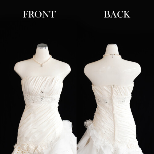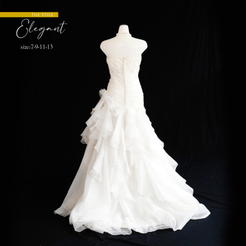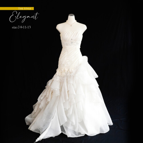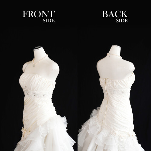マーメイドラインにAラインを調和させたアシンメトリーデザインのドレス。女性らしいボディーラインが綺麗なシルエットに流れるように斜めにフリルを贅沢にあしらったスカートは動くたびにふわふわと揺れて華やかさを演出。切り返し部分にはビジュー、ビーズ刺繡と巻きバラの花飾りがさり気なくフェミニンさアップ◎