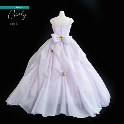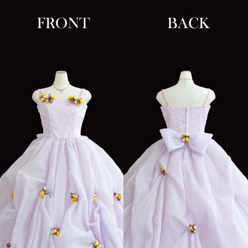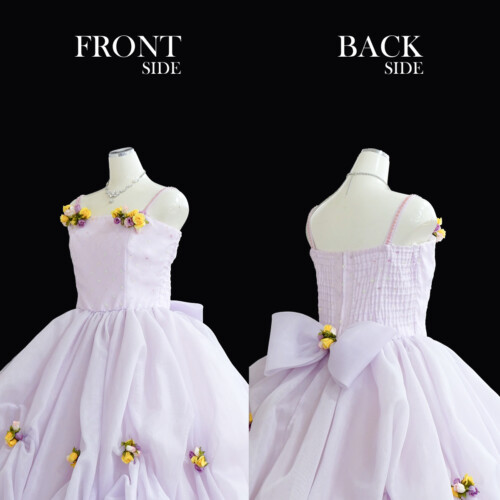フワフワとしたバルーン風スカートに小さな小花を散りばめられたフェミニンさを感じるどれす。シャーリング加工でサイズ展開が可能。コサージュも取り外しが可能なので、お好みの位置に付け替えが出来ます。