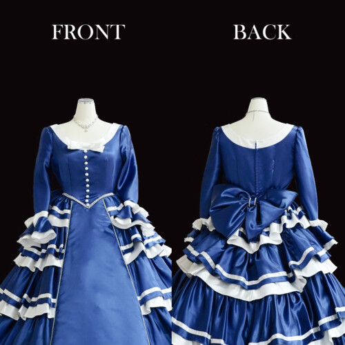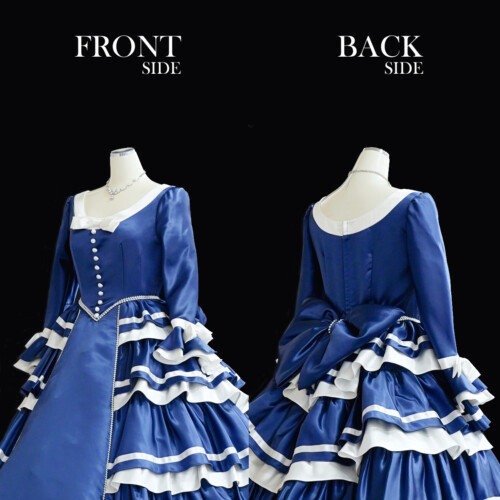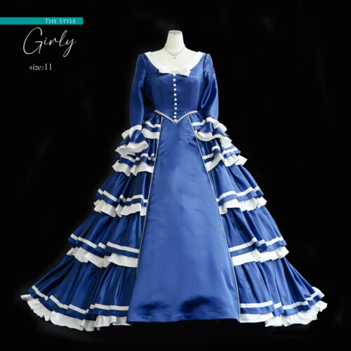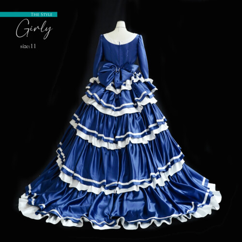 なめらかなU字にあいたデコルテ、袖口にかけて広がった七分丈のトランペットスリーブがかわいらしさを感じます。ブルーに白のライン段階スカートがボリューム感を出しています。アンティーク調のデザインが魅力的な雰囲気を感じさせます。