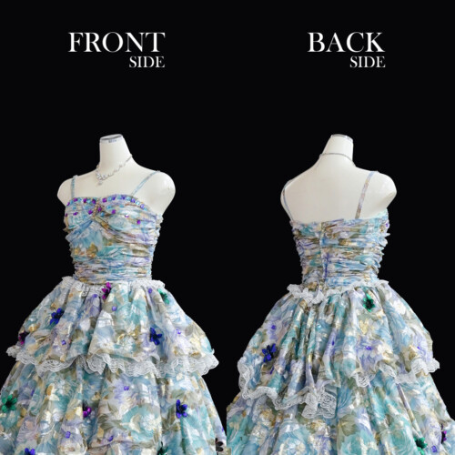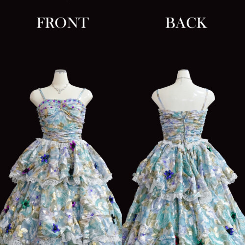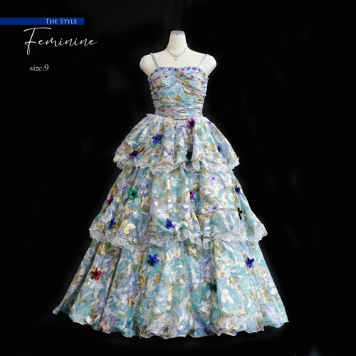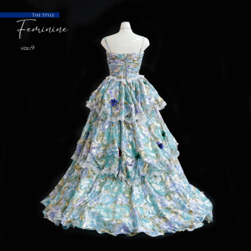 女性らしさが際立つ花柄プリントのドレス。ブルー系の爽やかな段階フレアースカートが広がりすぎずサラッとした印象。散りばめられたコサージュは取り外し可能。
