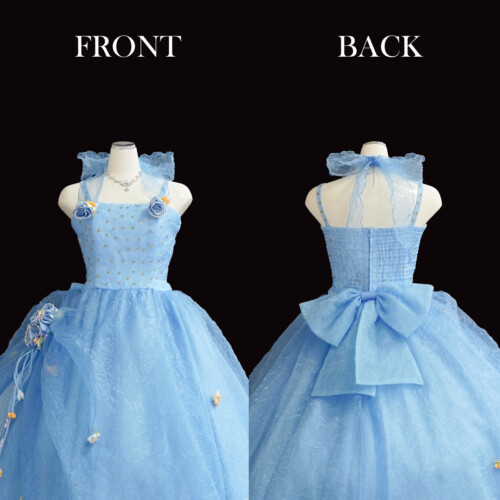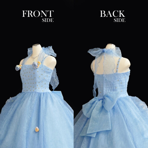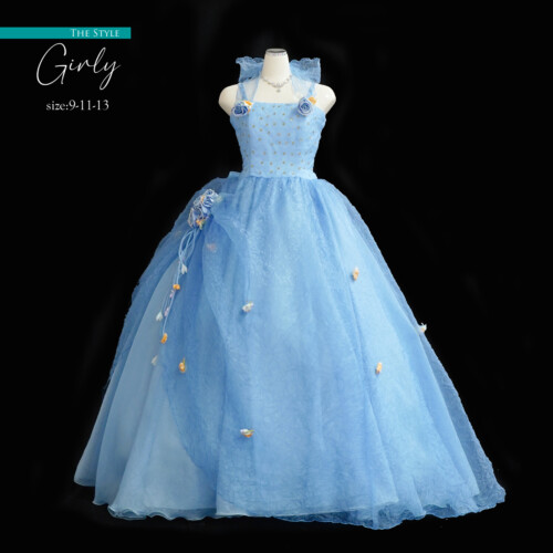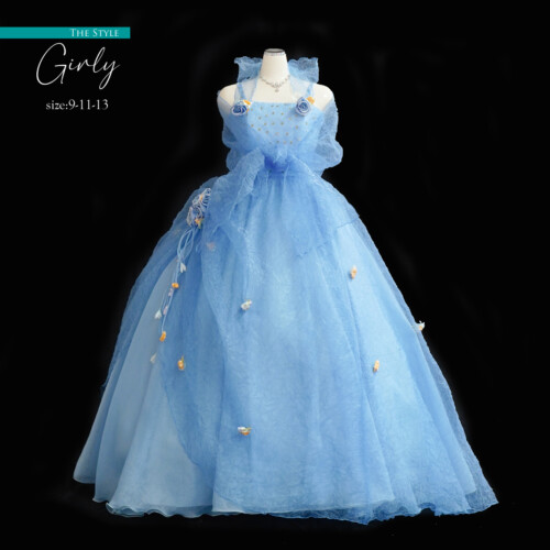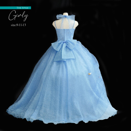 淡いブルーのチュール素材をウオッシャブル加工を施したエアリー感にふんわり感もブラスされた一着。チュール素材でリボン結びにホルダーネックにするデザイン。背中のシャーリング加工は幅広くサイズ展開が出来ます。花のコサージュは取り外すこともできるのでお好きな位置に付け替え可能。