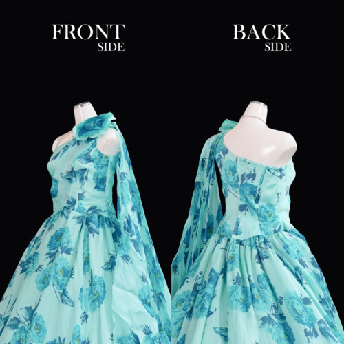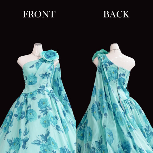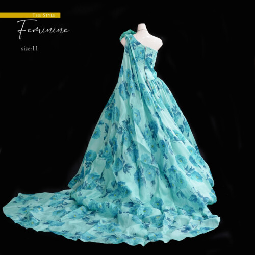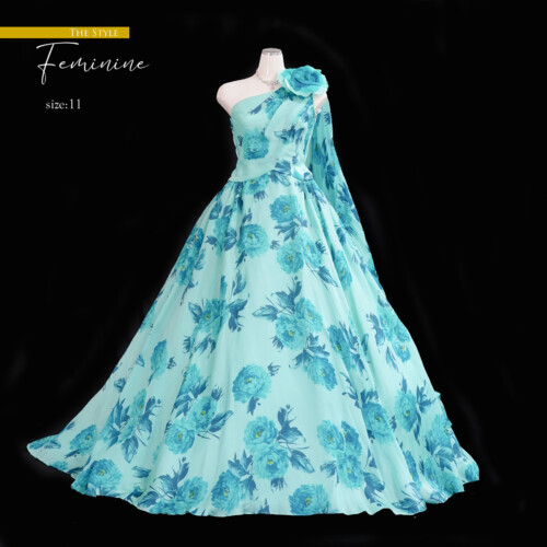 ブルー一色使いの大きな薔薇の絵柄をプリントされた上品な女性らしさを綺麗に見せてくれます。ワンショルダーから羽のように広がったストールが風を受けるとふんわりと幻想的。