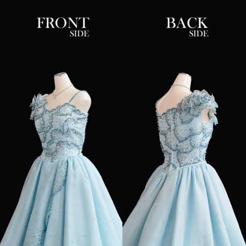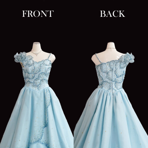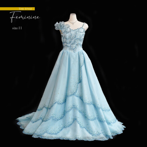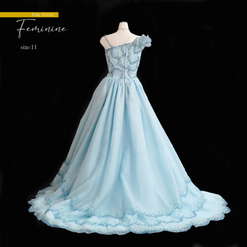 ビーズ加工でドレス裾に縁取りしスカラップラインを綺麗に見せてくれています。アシメトリー技法を活かして海の波打ち際のような流れをイメージさせるデザイン。