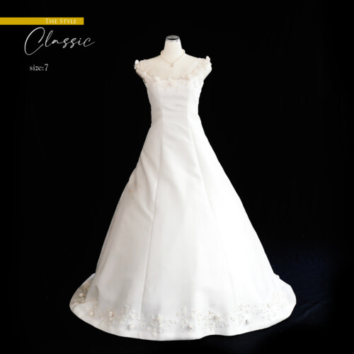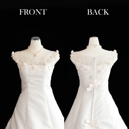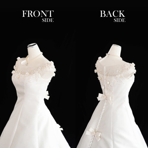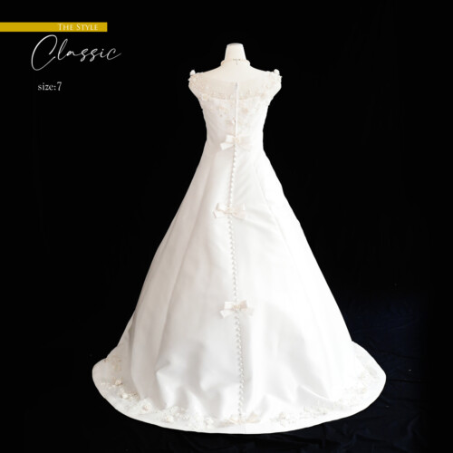 シルクジョーゼット素材の光沢感が気品あるエレガントな女性を演出。透かしを用いた襟元がデコルテをより美しく見せ立体的なバラのコサージュがポイントのデザイン。背中からスカートに施されたクルミドットボタンが後ろ姿にさらなる上品さをプラス。