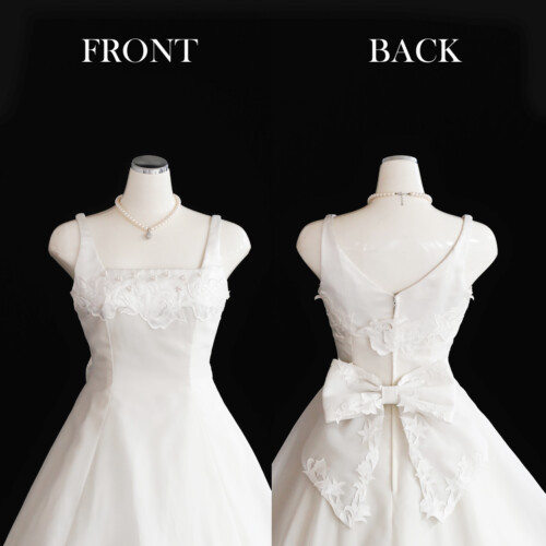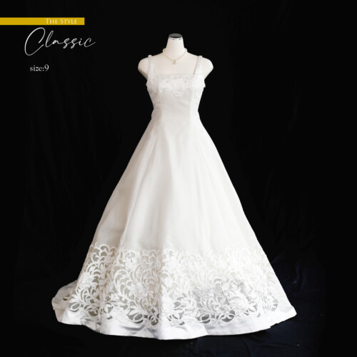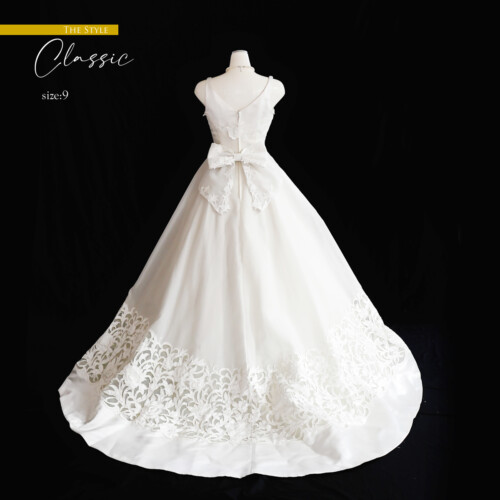 スカート裾には幅広に重厚感のあるカットレースを用いたロングトレーンがエレガントなドレス。クラシカルでシンプルなデザインにサテンの光沢感が気品のある王道Aラインドレスです。