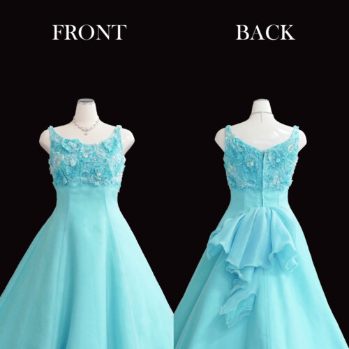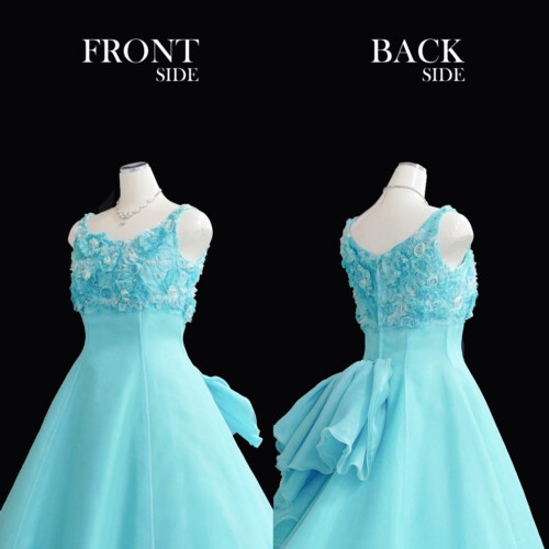 リボンフラワー刺繡を胸上のハイウエスト部分だけに施されており錯視効果で脚長が演出されます。ふんわりとチュール素材を重ね合わせた大きめのフレアーバックリボンが可愛らしさを印象付けます。