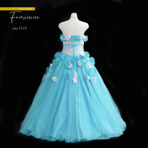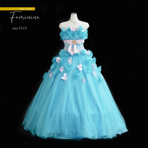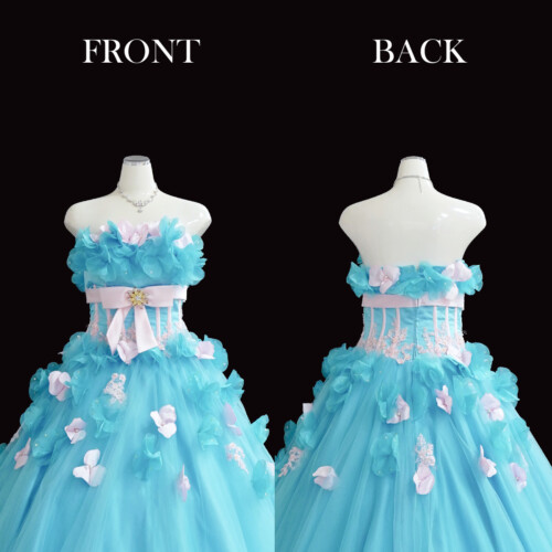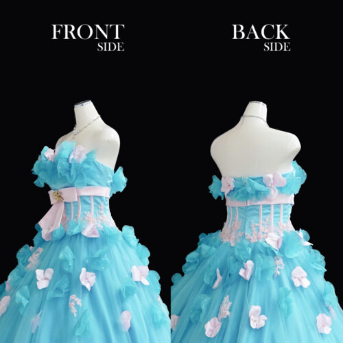 淡いブルーと淡いピンクのライトカラー、幸せの印象させる人気の色味のビスチェタイプのドレス。ふんわりとした花びらを重なり合わせたコサージュが優しい揺れて動きに可愛さをブラスします。