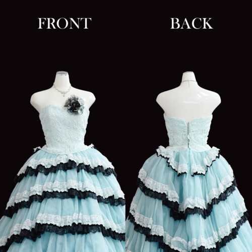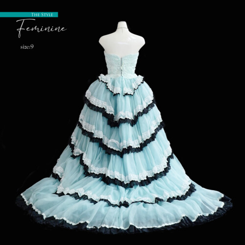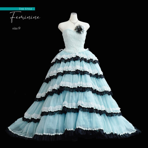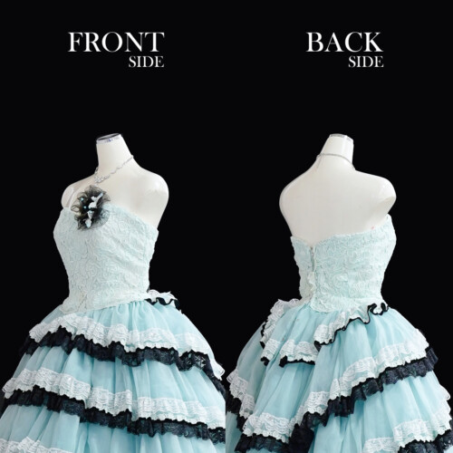 薄いブルーに黒のレースを組み合わせ斜めカットによって全体的にメリハリを感じます。多くのレースを使ってボリューム感を出してスタイルアップできるビスチェタイプドレス。