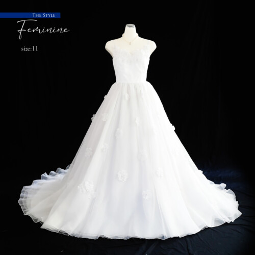大きく開いた背中のオープンバック仕様のAラインドレス。ふわっとしたチュール素材のスカートに白い小花のアップリケをちりばめ腰の大きなリボンが特徴。