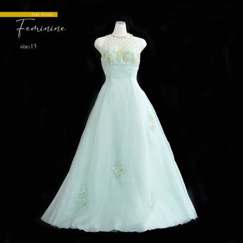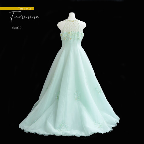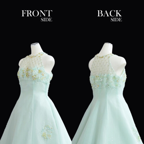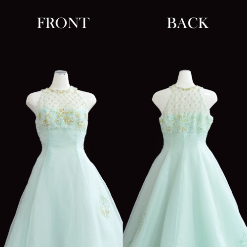 透け感あるホルダーネックにガラスビーズ加工を施し透明感をより引き立てます。繊細で大人っぽく、上品な女性らしさを演出します。