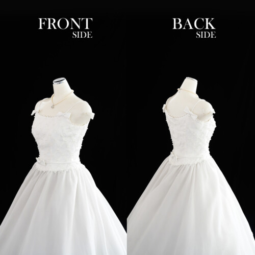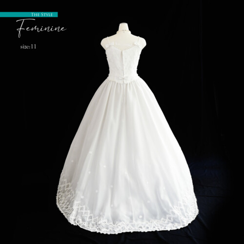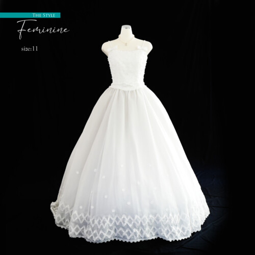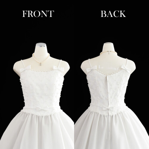 シフォンジョーゼットの柔らかく肌触りの良い素材を生かしてサラッとした女性らしいやわらかみのあるシルエットのドレスです。ボーダーレースの裾がキュートで各所にパールビーズとリボン飾りが甘めテイストで可愛らしさを引き立てます。