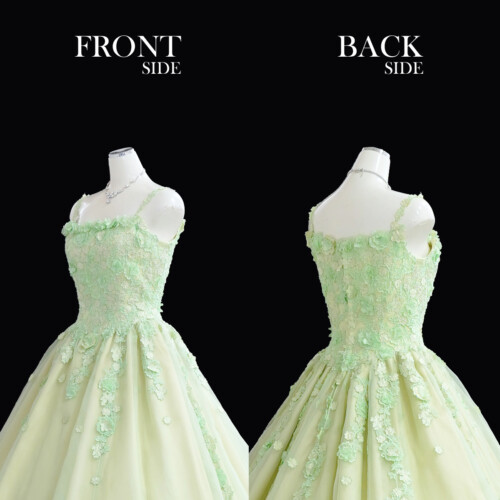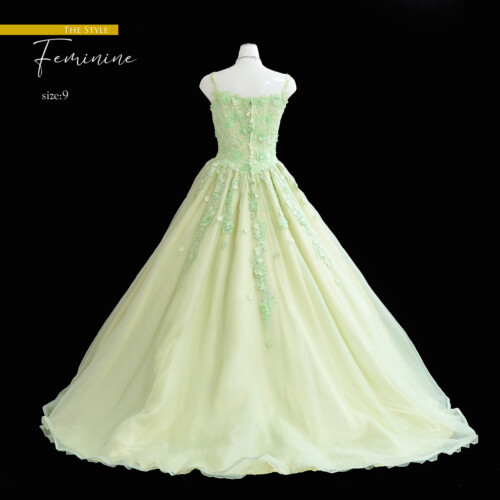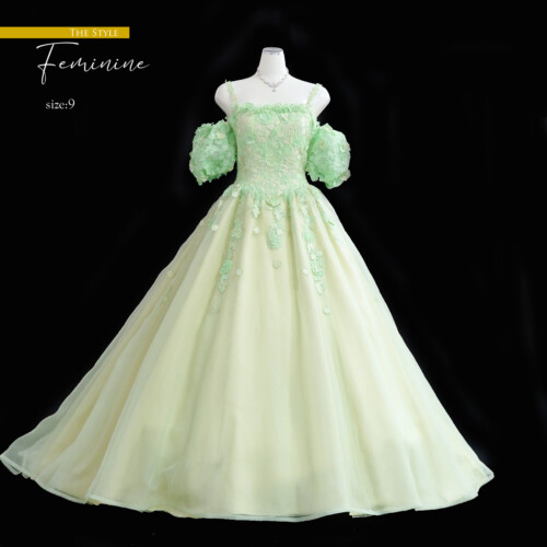 グリーンカラーは肌なじみがよくインパクトある鮮やかな色味。レース刺繡のアップリケが草の流れを感じさせ、春の若葉のイメージさせるグリーンは新しいスタートにピッタリです。
