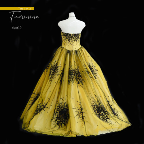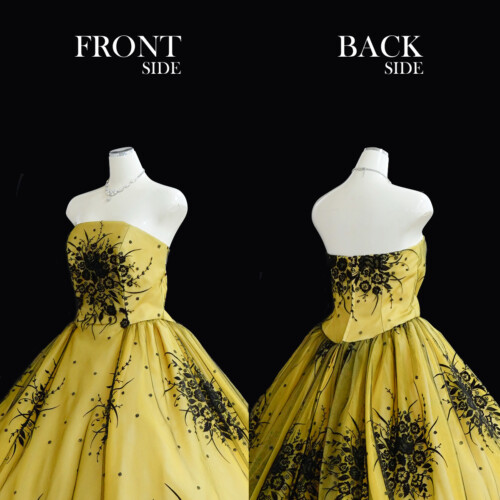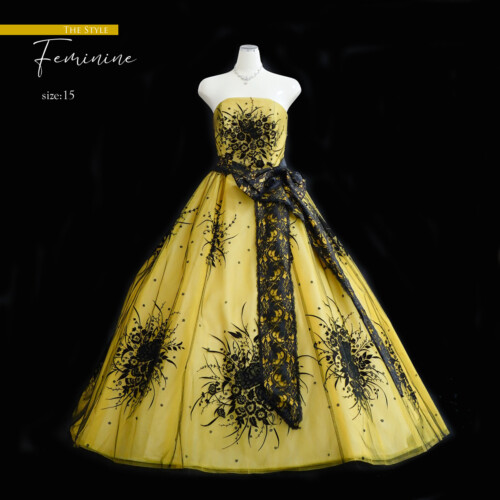 オリーブの実のようなカラーに、黒のレースをかぶせ落ち着いた雰囲気を感じます。ブーケ柄のフロッキープリントを施されており上品な女性らしさを演出。腰に結ぶ形のリボン、取り外し可能で結ぶ位置も自由に変える事が出来ます。