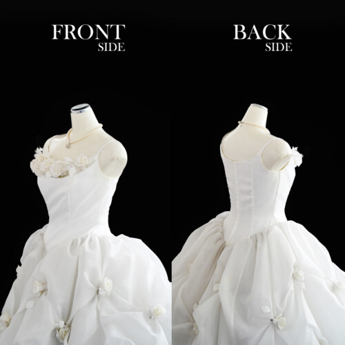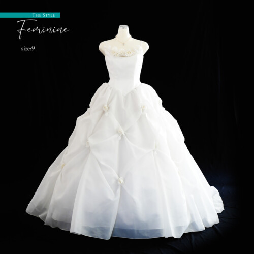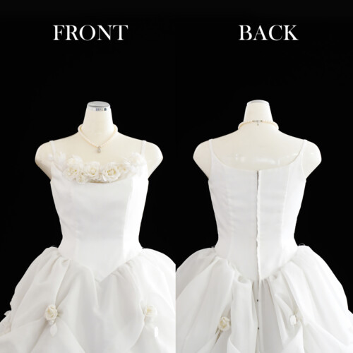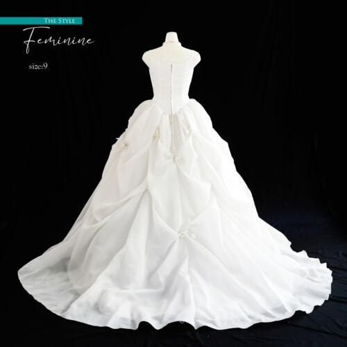 フワフワとオーガンジー素材を膨らませたバルーン風ドレス。大きく広がるボリュームあるトレーンに胸元とスカートに散りばめられた白いバラのコサージュがより立体的でやわらかなシルエットへ引き立てます。
