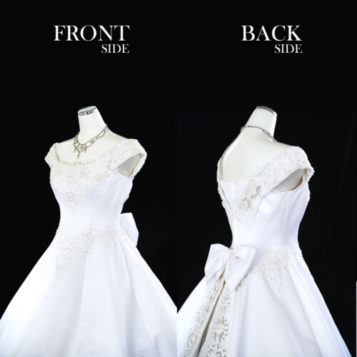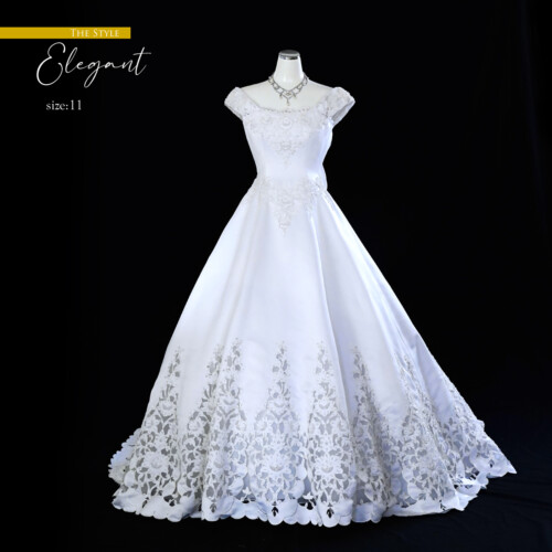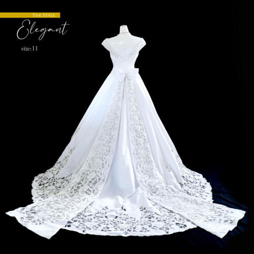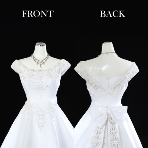 上質なシルクサテンと豪華で繊細に加工を施したケミカルレースを上品に使用したドレス。オフショルダーラインと腰から流れる大きなリボンにはパールビーズ加工され、シンプルでありながら品のある上質デザインはまさに正統派ドレスです。