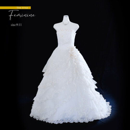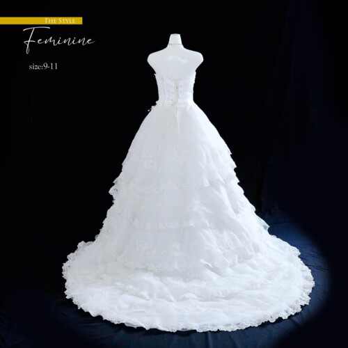 グリッターラメをドレス全体に散りばめ、動くたびにキラキラと輝きを放って煌びやかなドレス。前から後へとバックトレーンに流れるように重ねてデザインされた段フリルがふんわりとしたシルエットが特徴。オフホワイトの色合いがドレスデザインのフェミニンさをより引き立つ一着。