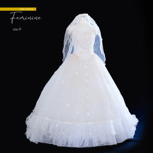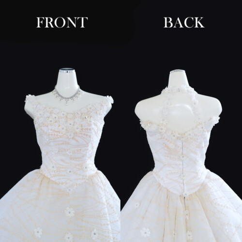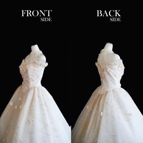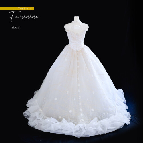 チュール素材にグリッター加工がふんだんにあしらわれ品のあるディテールに凝ったドレス。オフショルダー、胸元にはレース花にビース、大きく広がったスカートにオーガンジーフリルと王道フェミニンスタイル。