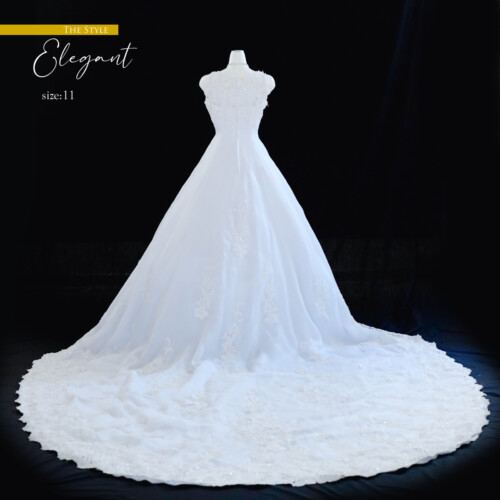 スカート裾には幅広のレース使いのロングトレーン。上品かつ豪華でクラシカルなドレス。デコルテの透け感が気品のある女性らしい優雅な印象を感じさせます。