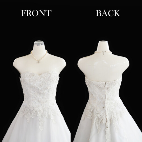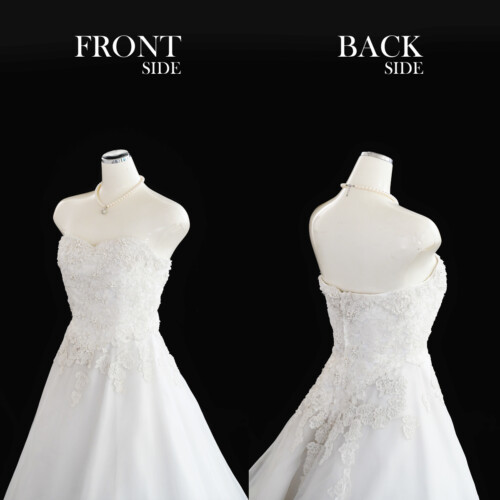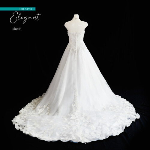 チュール素材にサテンリボンをボーダー状にデザインされ、さらに花柄をプリントしたアップリケを散りばめられたフェミニンスタイル。専用のマリアベールがよりアクセントとなり無垢で純真な女性の印象となります。
