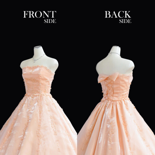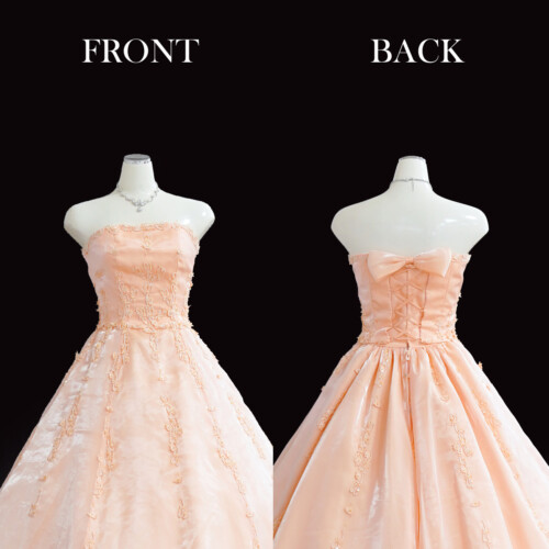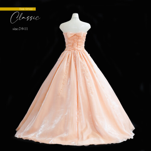 光を受けて色の光沢感を感じ可憐なイメージに。クラシカルなデザインの中に華やかさを盛り込まれ、印象的な美しさが漂う一着。