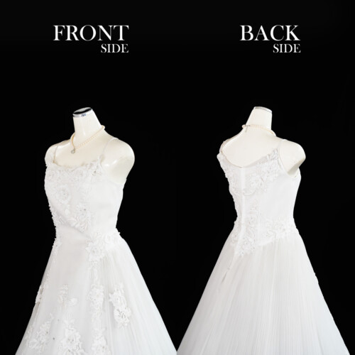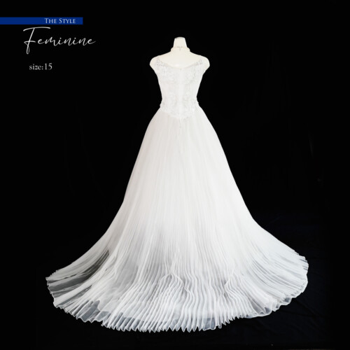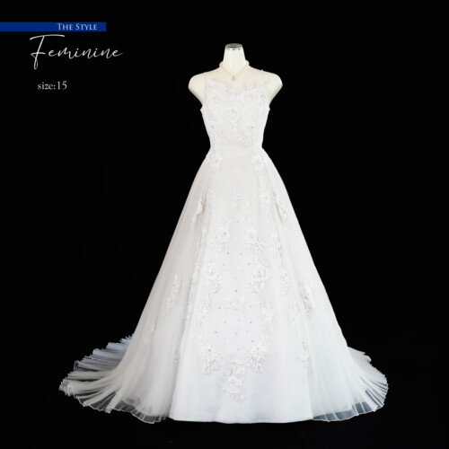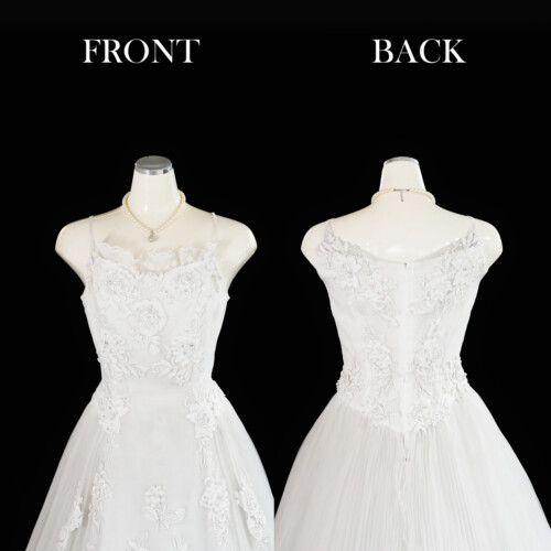 張りのあるチュール素材を使用したAラインドレス。スカート裾にはアコーディオンフリルを重ね合わせてエレガントな印象となります。花のレースとラインストーンを散りばめられさり気なく煌びやかなディテールが女の子らしいドレス。